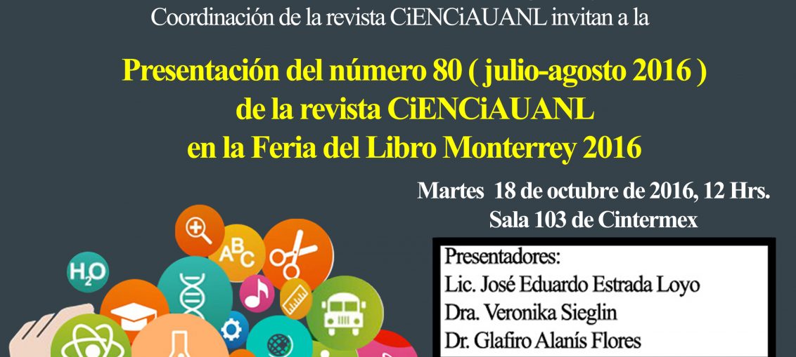 Presentación del número 80 (julio-agosto 2016) de la revista CienciaUANL en la Feria del Libro Monterrey 2016 Ciencia en Breve - 19 noviembre, 201621 noviembre, 20160 Compartir en Facebook Compartir Compartir en TwitterTweet Compartir en Google Plus Compartir Compartir en Pinterest Compartir Compartir en Linkedin Compartir Compartir en Digg Compartir